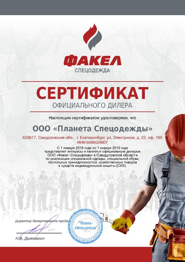 с 1 января 2018 года, наша компания является официальным дилером ООО "ФАКЕЛ -СПЕЦОДЕЖА" в Свердловской области.